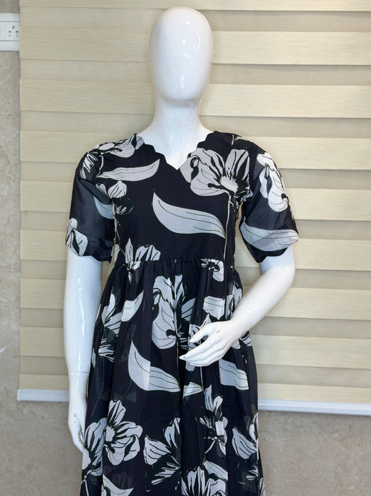 Black White Floral Printed Georgette Outdoor Non-Feeding Maxi