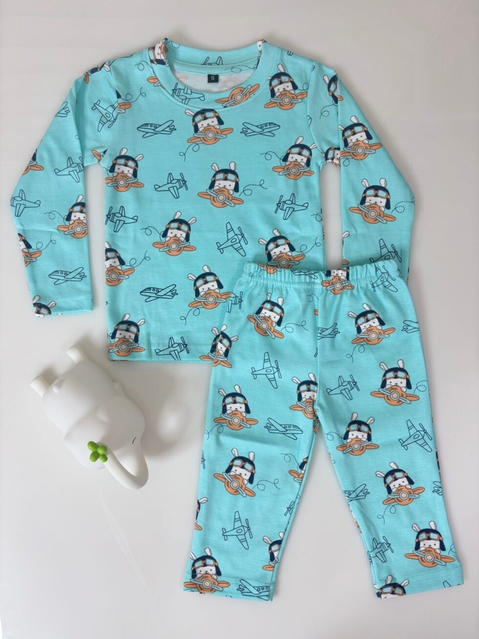 Aqua Cartoon Pilots Printed Interlock Full-Sleeve T-Shirt and Pant Co-ords