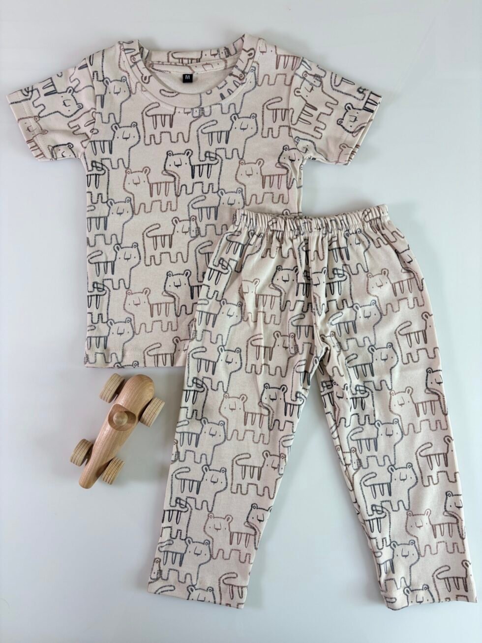 Beige Bear Figures Printed Interlock T-Shirt and Pant Co-ords