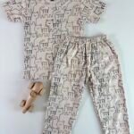 Beige Bear Figures Printed Interlock T-Shirt and Pant Co-ords