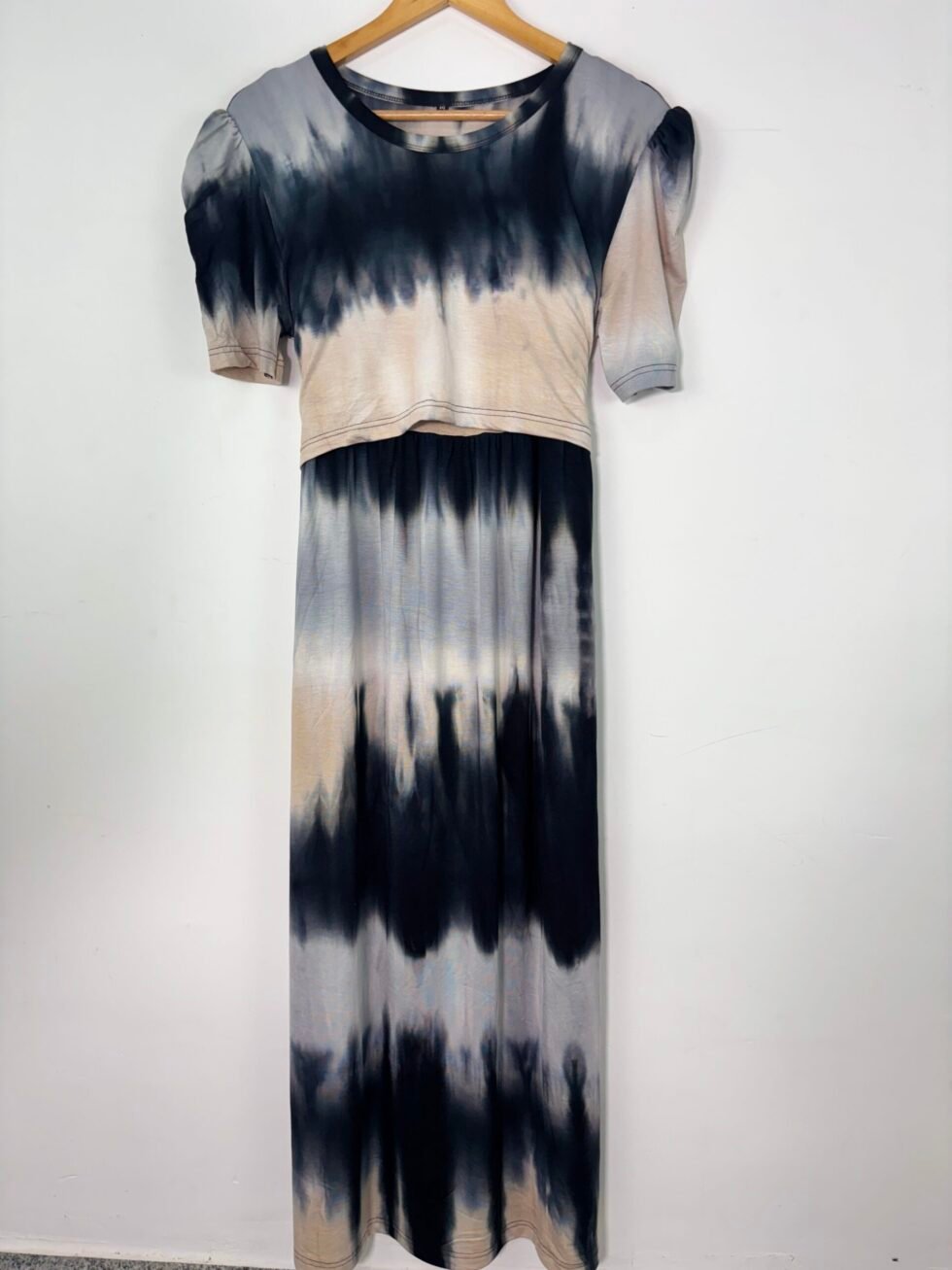 Black and Sandal Dye and Tie Printed Puff Sleeve Feeding Maxi
