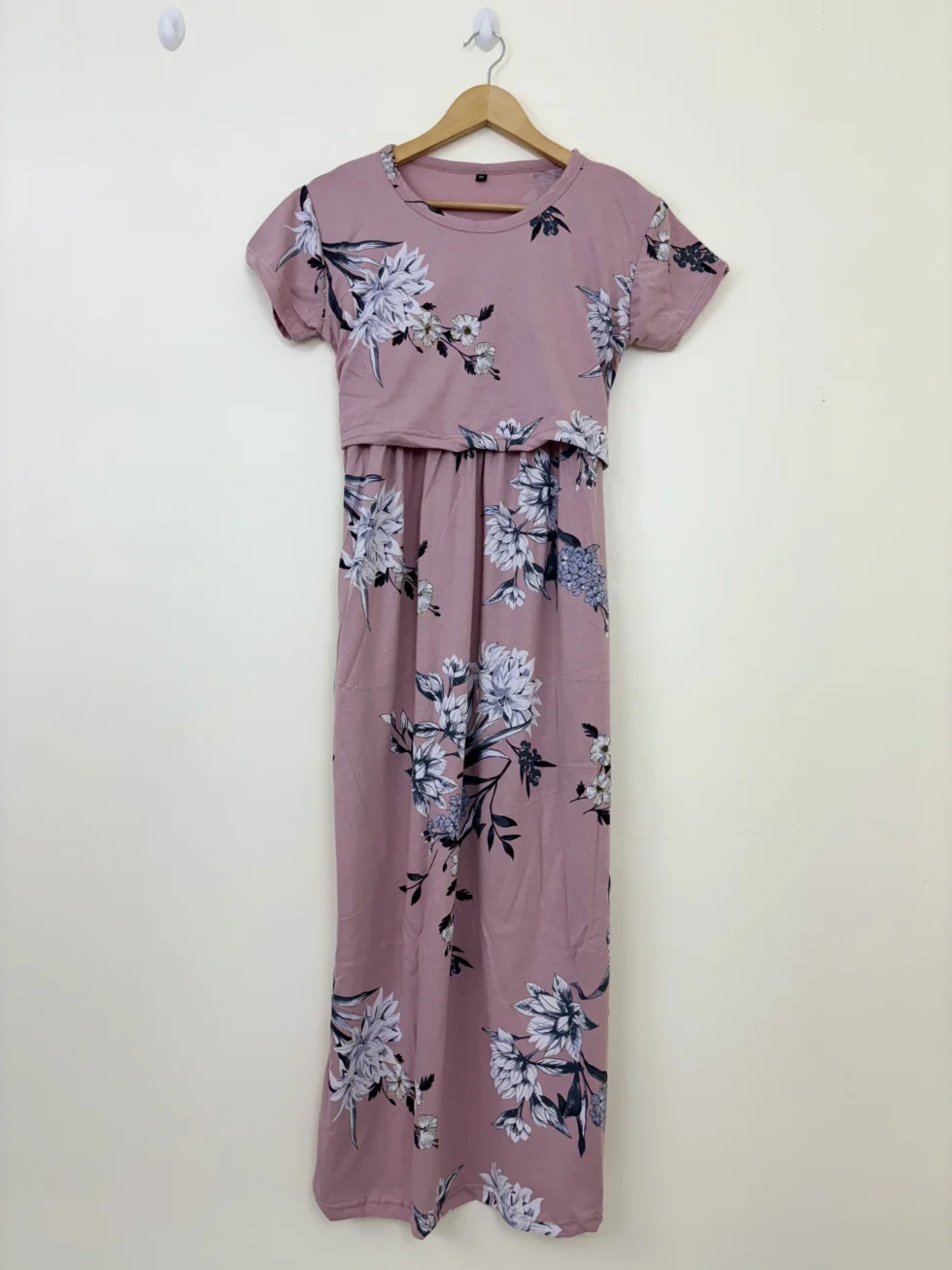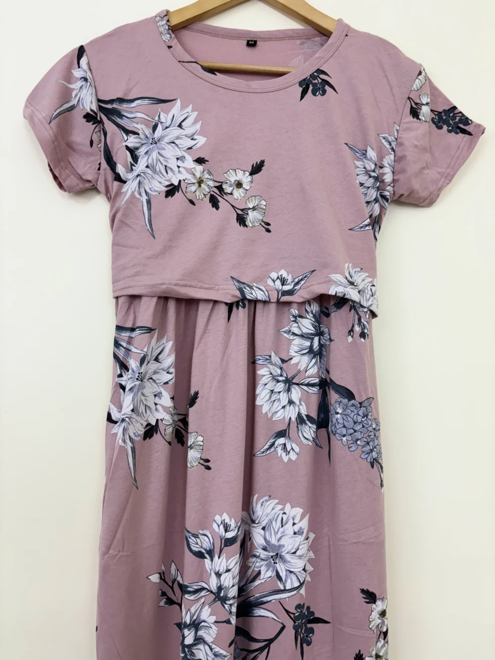 All-over printed nursing-friendly maxi dress comes with zipless flap opening for feeding. Calf length maxi comes with flared hem and gathered waist that grows along with the bump throughout the pregnancy. Short sleeve maxi has additional back tie-strings for personalized & comfortable fit.