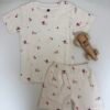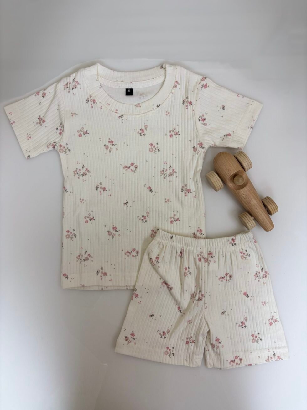 Half White Ribbed Pink Flowers Printed Kids T-shirt and Shorts Coords