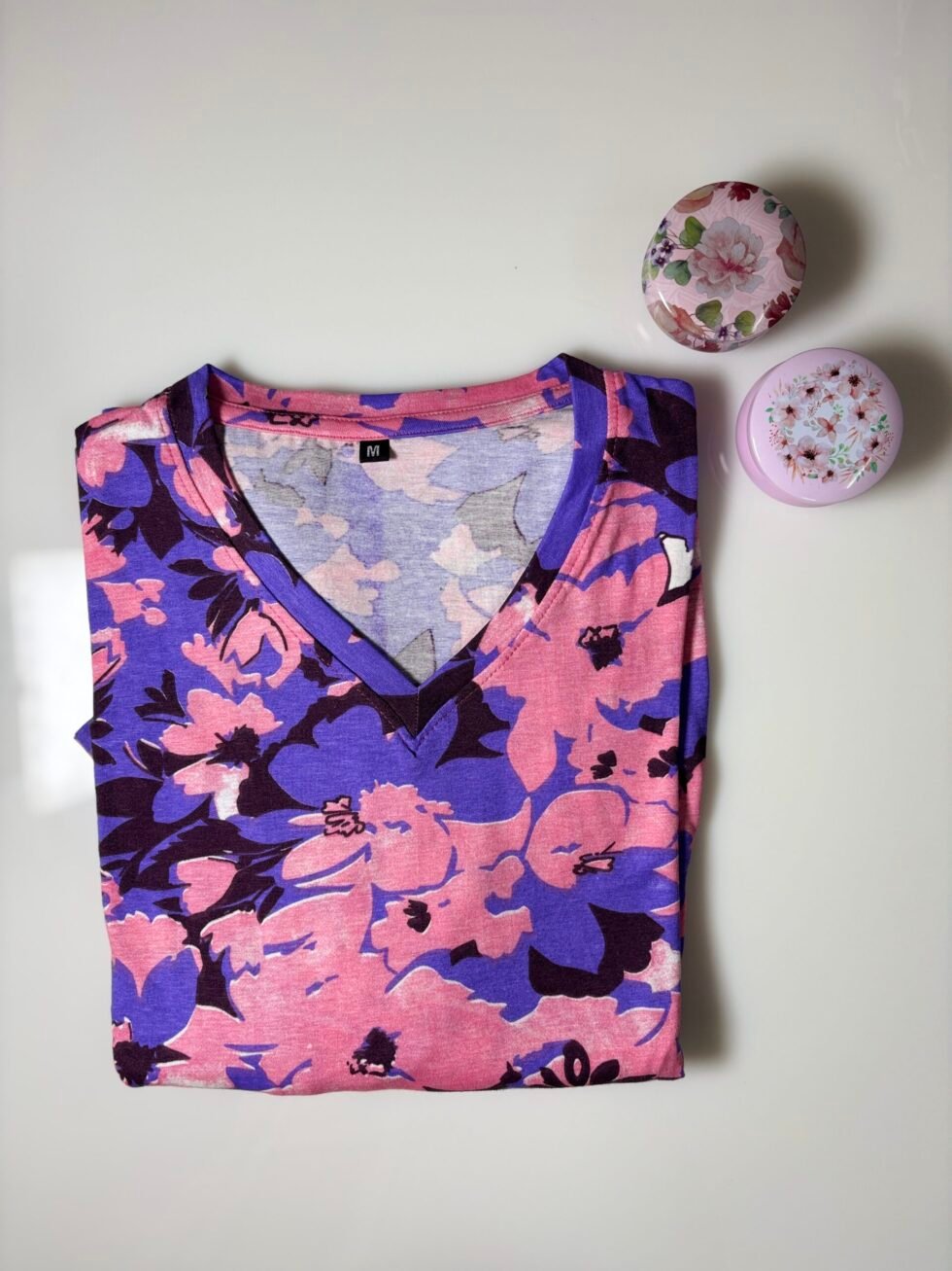 Pink and Violet Floral Printed Knitted V-Neck Cotton Lounge Frock