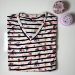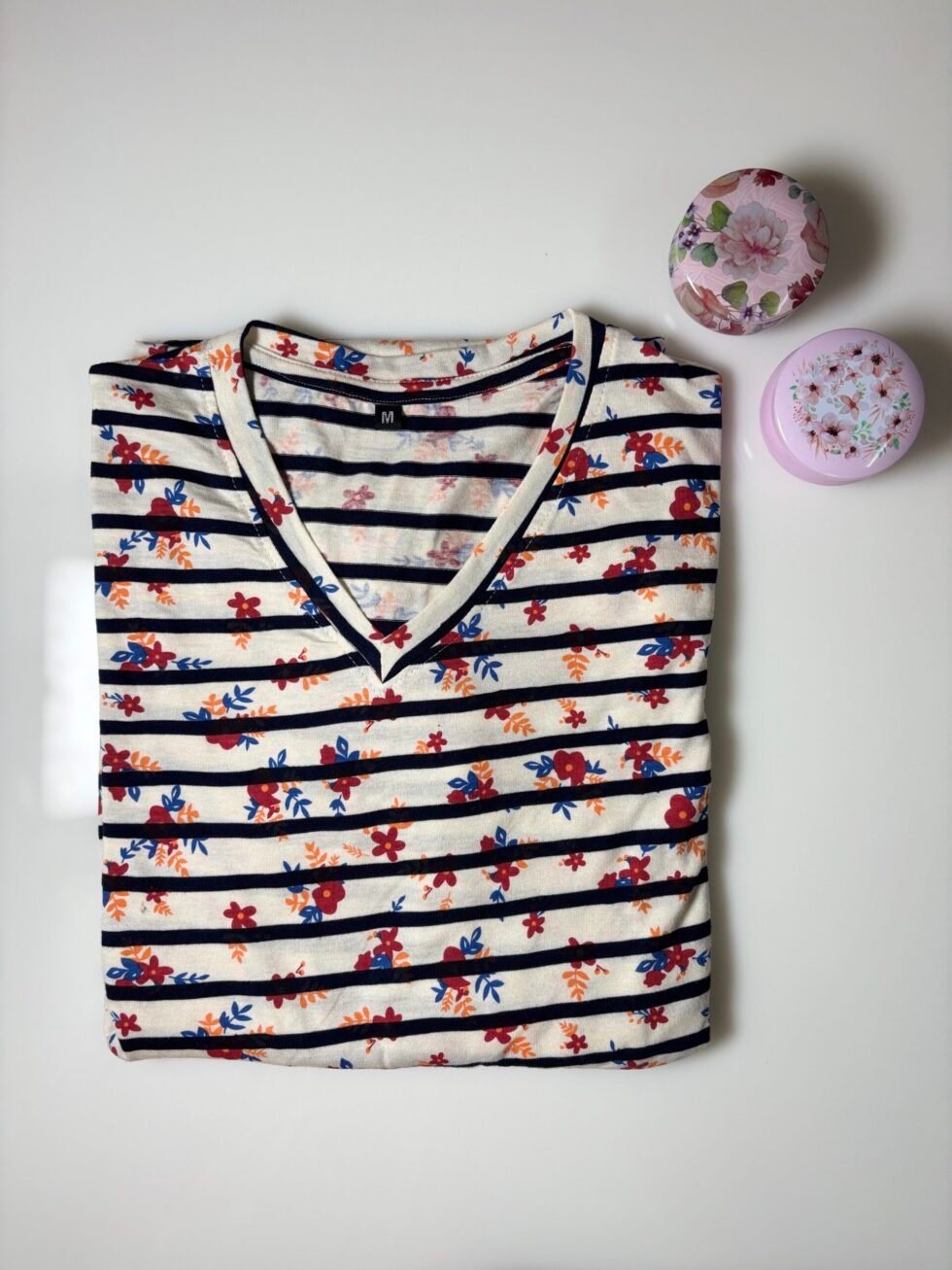 White Stripes Floral Printed Knitted V-Neck Cotton Lounge Frock